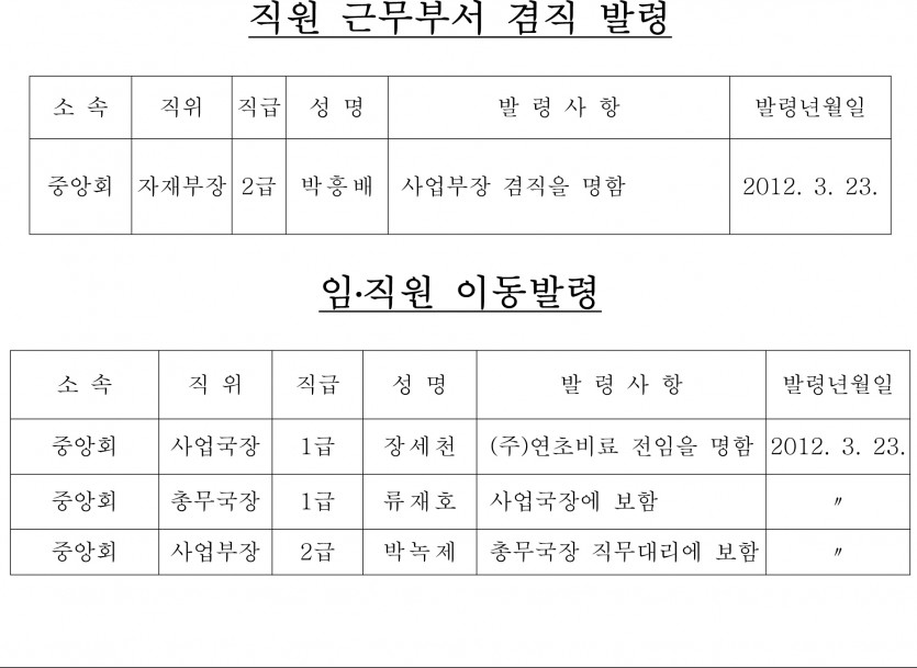 임직원 이동 발령 및 직원 근무부서 겸직 발령 > 공지사항
