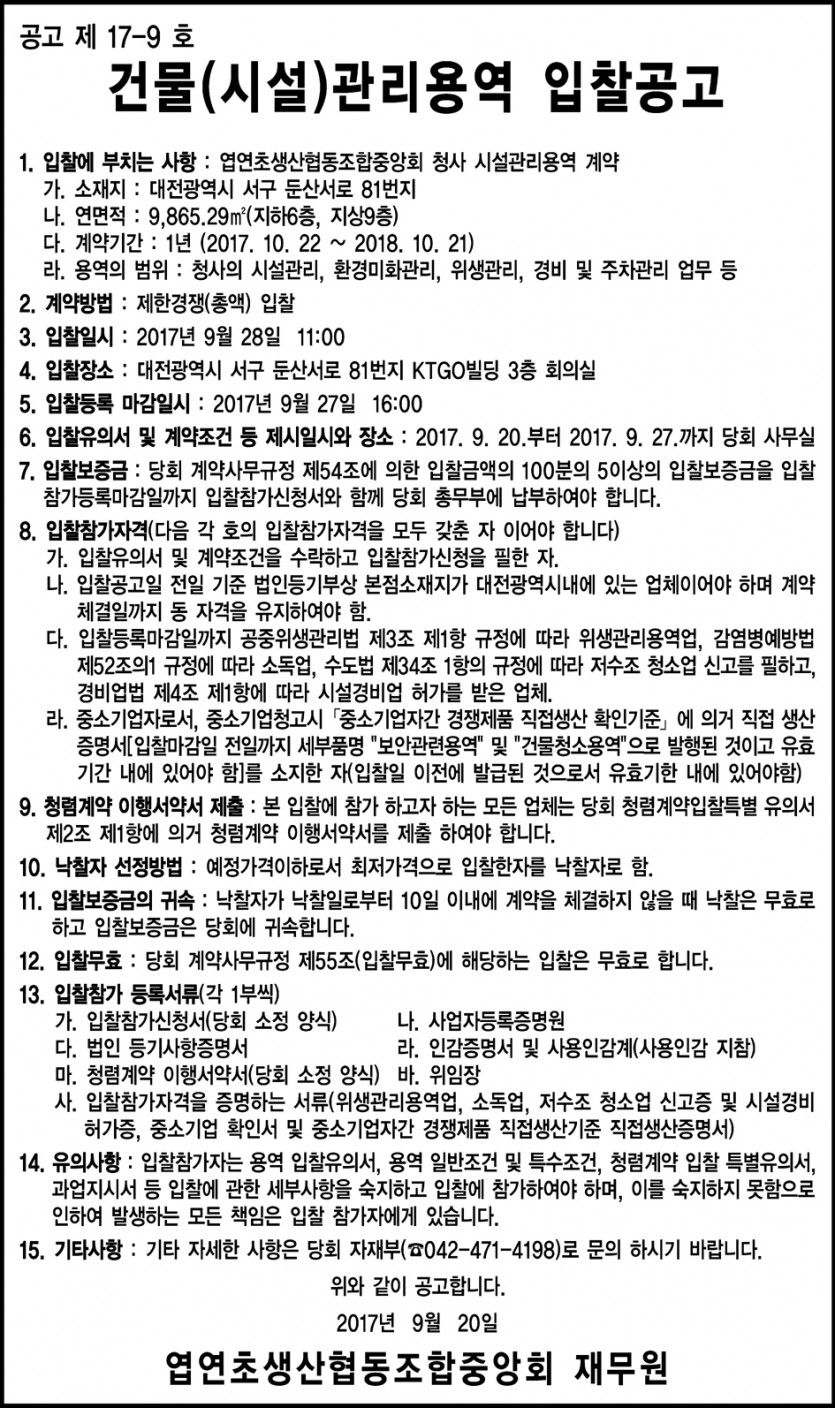 KTGO청사 시설관리용역 입찰공고 작성일2017-09-19 본문 KTGO청사 시설관리용역에 대한 공고와 시방서 및 관련서식입니다. 첨부파일 시설관리시방서-2017년도.hwp 입찰관련_서식[1].hwp 이전글 다음글 목록
